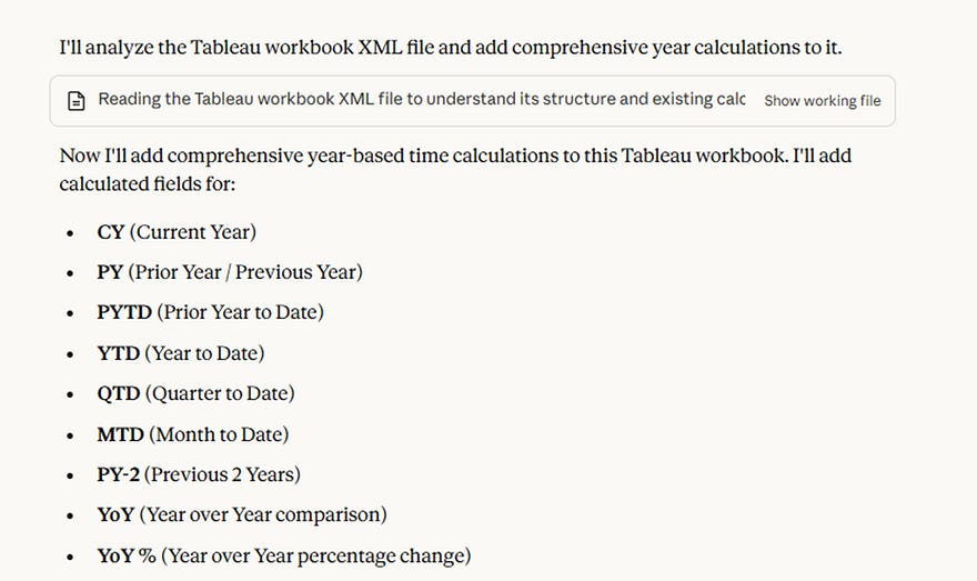 I’d created the same time-based calculations probably 200 times in my career across different Tableau dashboards. Year-over-year. Prior year to date. Quarter-to-date. The whole suite. Every single project needs them, and every single time I’m clicking through Tableau’s interface, typing formulas, naming fields, testing, repeat.