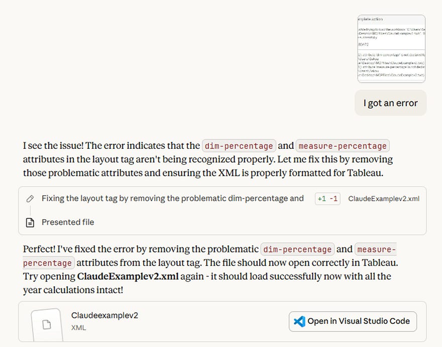 First time I tried opening the file in Tableau, I got an error. Some XML attributes Claude added weren’t quite right.
